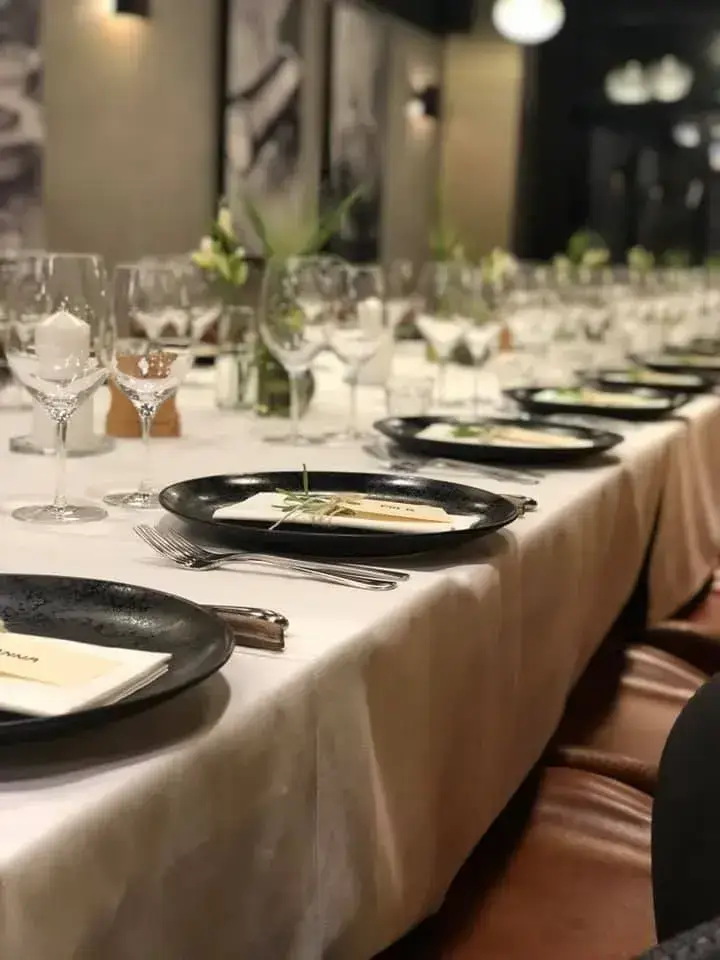 Personlig borddækning til selskaber hos Restaurant Cooks – perfekt til festlige lejligheder og middage.